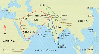 After this Divine Call, Guru Nanak spent about two decades travelling to different places in India and adjacent countries. During the four long journeys he travelled as far as Assam in the east, Sri Lanka in the south, Tibet in the north and Mecca in the west. He met people of various faiths; Hindus, Muslims, Buddhists, Jains, Sufis, Yogis, and Sidhas. Bhai Mardana, a Muslim minstrel, was his companion during these journeys. He travelled to spread the Word of God, love, peace and harmony among humankind. He expressed his views forthrightly and clearly on God and His Creation, the place of human beings in the universe and how human beings can free themselves from the bondage of the ego self by dwelling on (Naam) the Name of the Lord.